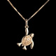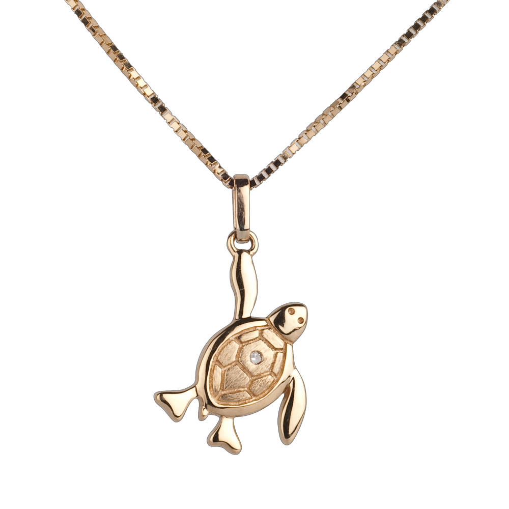 Un bebe tortuga en plena acción para reencontrarse con el mar. Su caparazón es en oro amarillo tallado y adornado de un diamante.