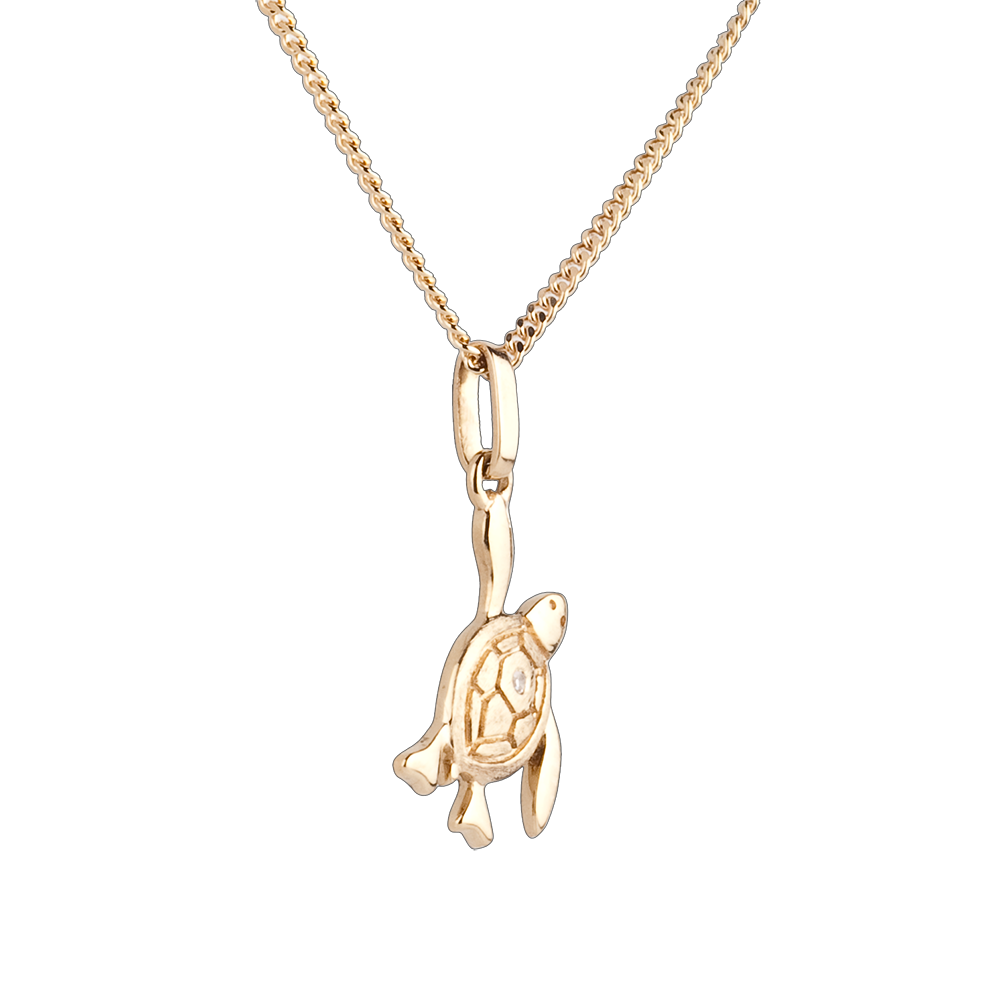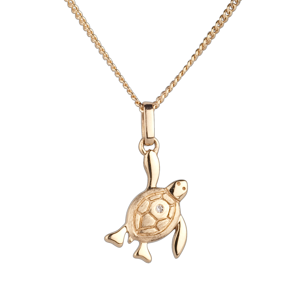Un bebe tortuga en plena acción para reencontrarse con el mar. Su caparazón es en oro amarillo tallado y adornado de un diamante.
