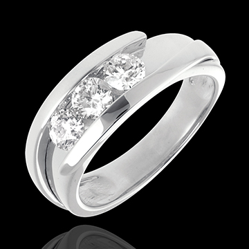 Una montura sobria y clásica realzada por un delicado junco que se abre a una trilogía de diamantes.