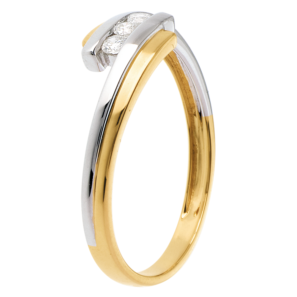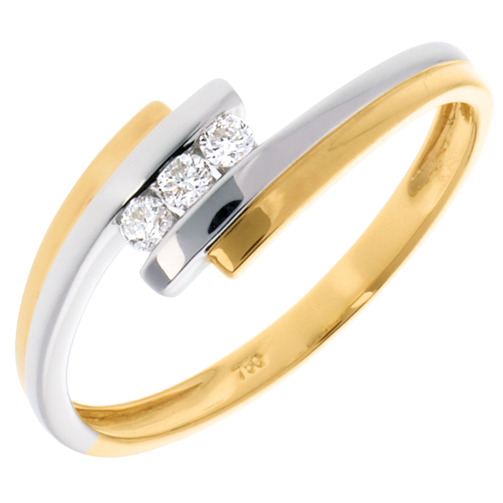 Una trilogía de diamantes acompañada de una pieza doble en Oro Amarillo-Oro Blanco, para un anillo femenino y delicado.